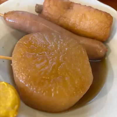 お店の雰囲気は入口から居酒屋風。カウンター席で店長さんと話しながら食べるのも楽しいです。冬はストーブが炊かれていて、ほっこり温まります。そんなときにぴったりなのがおでん。大根、卵、こんにゃく、牛すじなど定番具材がじっくり煮込まれ、出汁が染みて絶品。チーズカレーうどんと一緒に頼んで、居酒屋気分を満喫してください。店長さんの人柄も良く、いつも笑顔で迎えてくれます。