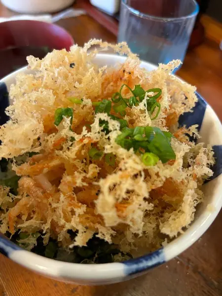 鐘庵の看板メニューがチーズカレーうどん。カレーうどんのコクにチーズがとろ〜りと絡み、ピリッとしたスパイスとまろやかなチーズのバランスが絶妙です。うどんはもちもちで、食べ応えも満点。チーズの上に赤いトッピングがかかっていて、これがうまみの秘密! 桜えびラー油風のアクセントで、ピリ辛と香ばしさが加わって、やみつきになる味わいです。この赤いスパイスが本当は何でできてるのか知っている人がいたら、ぜひ教えてください!企業秘密かもしれませんが! 個人的には、世界一のチーズカレーうどんと言っても過言じゃないくらいおいしいです。静岡名物の桜えびかき揚げをトッピングしても最高です。